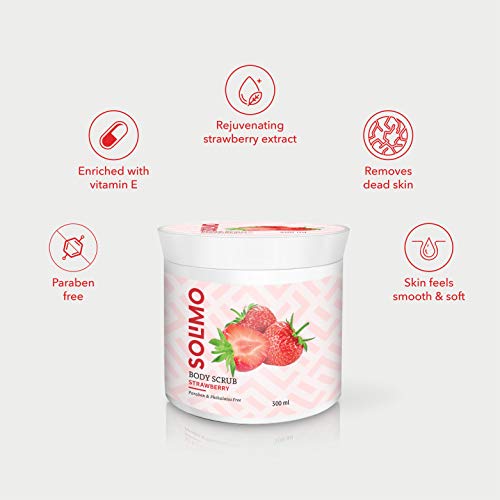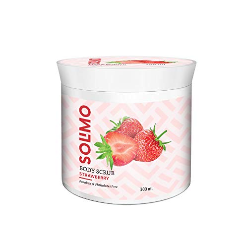 Infused with the goodness of berries along with walnut shell powder and vitamin E, Solimo Strawberry Body Scrub gently opens up blocked pores, removes dead cells from your skin giving it the extra care it needs.
