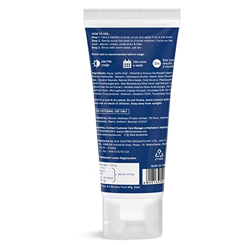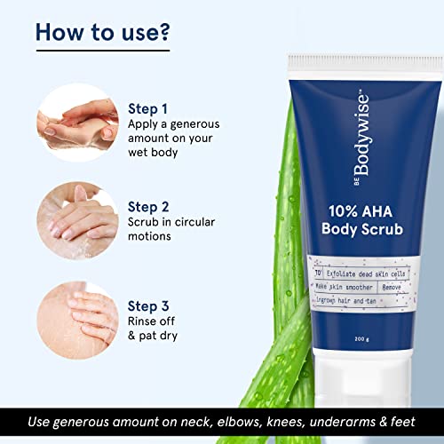 Be Bodywise 10% Lactic AHA Exfoliating Body Scrub (200g) | For Tan Removal & Soft-Smooth Skin | For Women | De-Tan Bathing Scrub with Centella Water & Aloe Vera, Removes Dirt & Dead Skin from Neck, Knees, Elbows & Arms