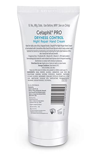 Cetaphil Pro Dryness Control Hand Night Cream Cream is specially formulated for dry to very dry skin on the hands. It is clinically proven to repair the skin barrier overnight. It provides instant and long lasting 24 hours hydration with a single application. It reduces skin roughness in 1 week when used as a regimen with Cetaphil Pro Dryness Control Hand Day Cream. The product is uniquely formulated with Niacinamide, Pro-Vitamin B5, Meadowfoam Seed oil & Vitamin E. It is non-sticky, hypoallergenic, fragrance free & paraben free. From the No. 1 Dermatologist recommended brand.