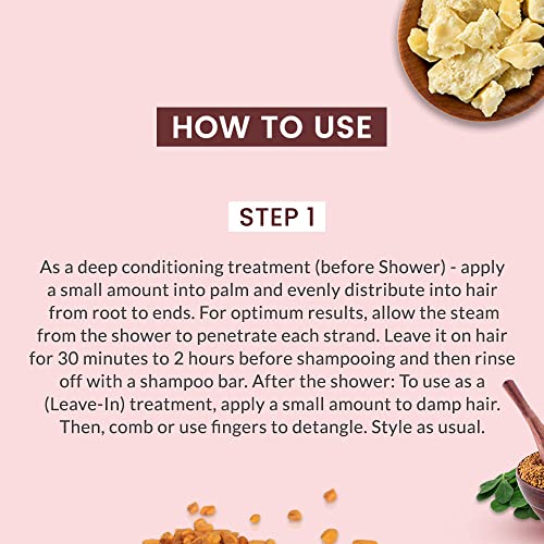 How To Use: Apply a small amount into the palm and evenly distribute into hair from root to ends. For optimum results, allow the steam from the shower to penetrate each strand. Leave it on hair for 30 minutes to 2 hours before shampooing and then rinse off with a shampoo bar.
