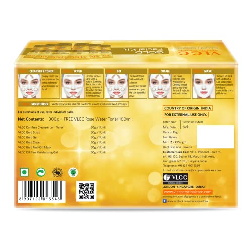 VLCC Gold Facial Kit with FREE Rose Water Toner – 300 g + 100 ml | 24K Colloidal Gold And Aloe Vera At Home Facial Kit | Bright & Radiant Complexion, Skin Cell Regeneration | Instant Glow Facial.